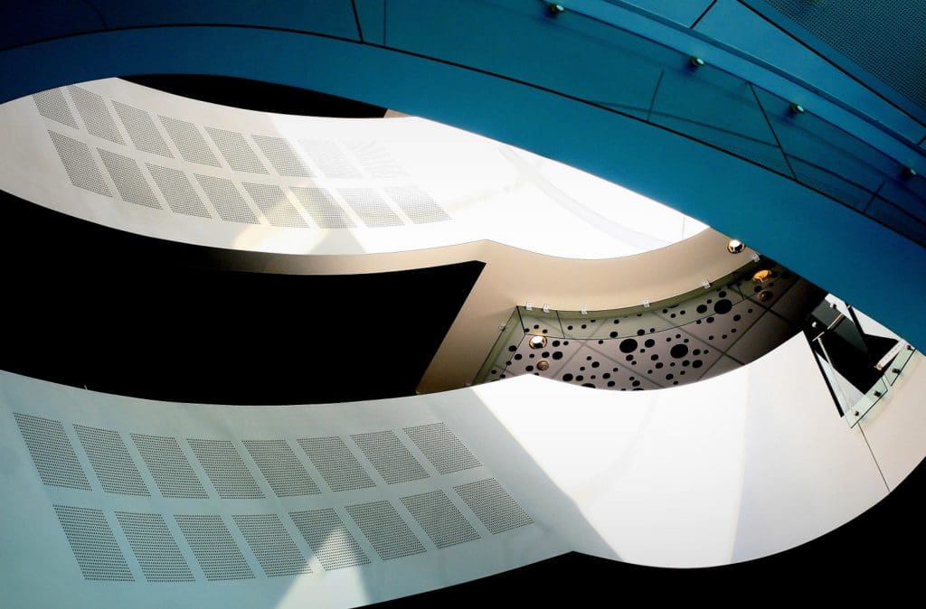 The Port Office building reflects features of its local environment. The shape of the building resembles a cruise ship, with a bow wave carved into the adjacent lawn. In addition, level two meeting rooms are suspended in space in a similar manner to shipping containers being loaded onto a vessel.